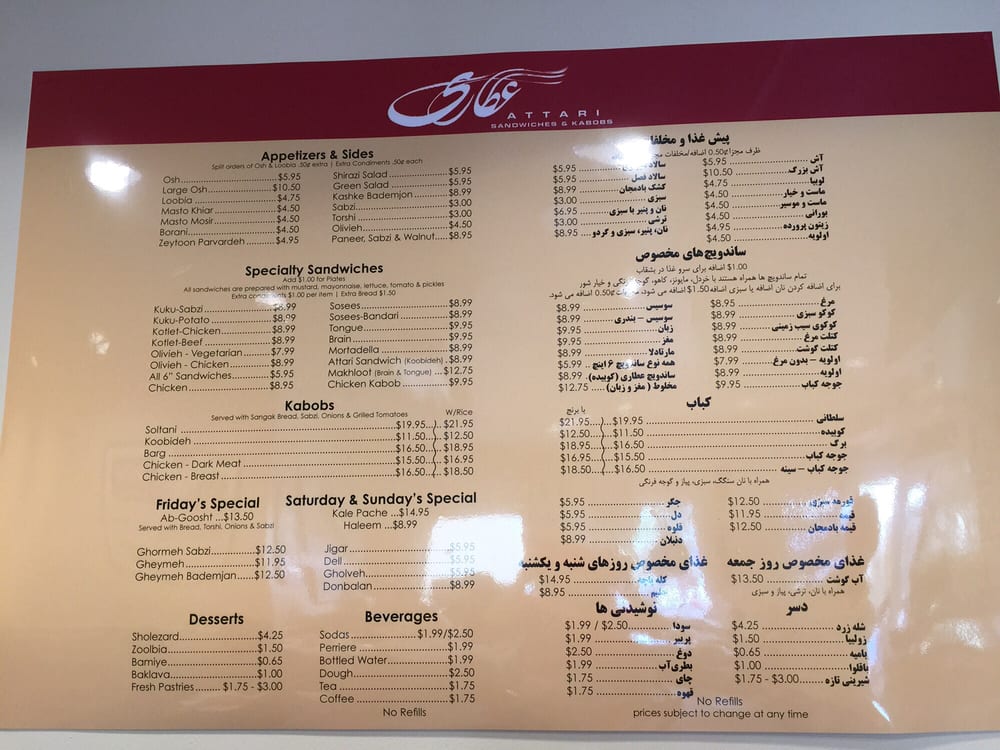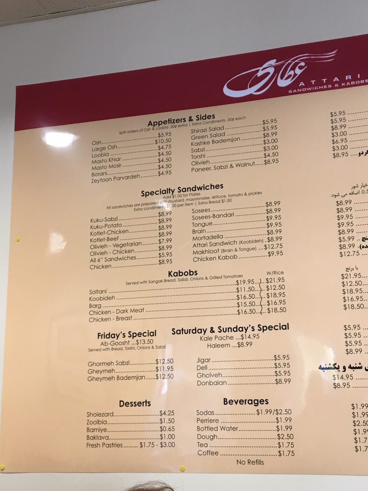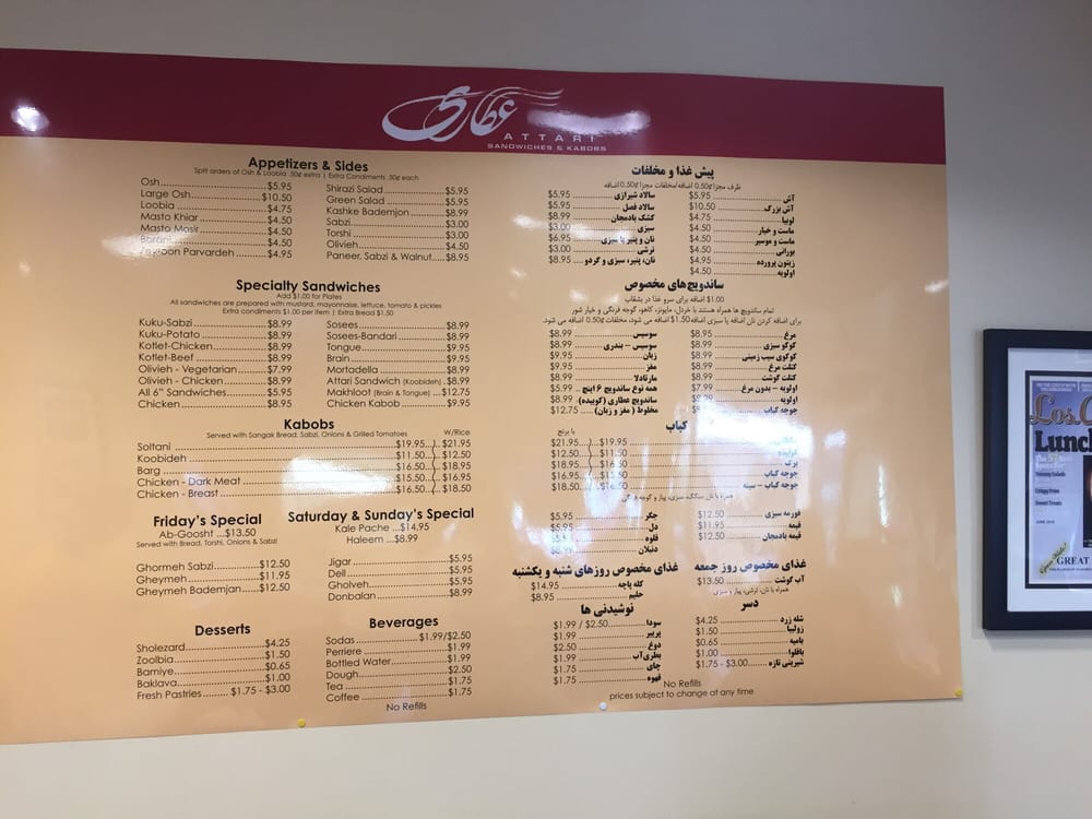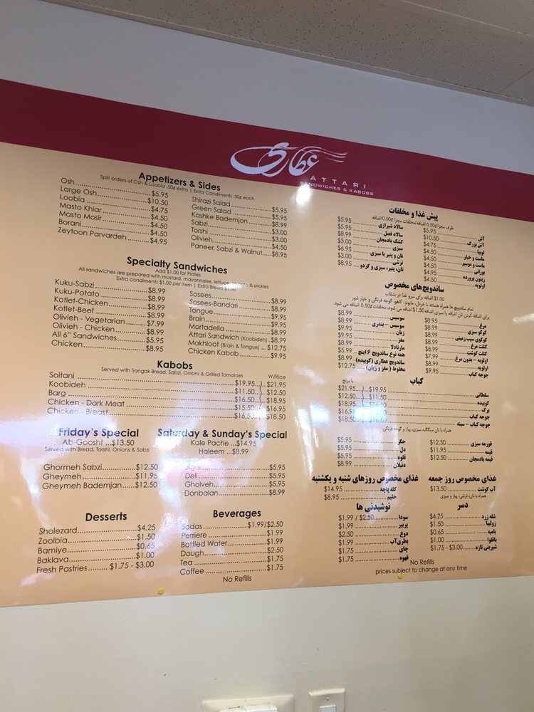 Welcome to Attari Sandwich Shop, a hidden gem in Los Angeles offering a unique blend of Persian flavors. With a variety of appetizers like Osh and Kashke Bademjon, as well as specialty sandwiches like the Beef Attari and Kuku Sabzi, Attari Sandwich Shop truly delivers on taste and quality. The Kabobs, including Chicken Koobideh and Ghormeh Sabzi, are cooked to perfection and are a must-try for any meat lover. The cozy atmosphere and excellent service make dining here a delightful experience. Customers rave about the friendly staff, generous portions, and the authentic Persian cuisine served here. Don't miss out on the chance to savor these delicious dishes at Attari Sandwich Shop!