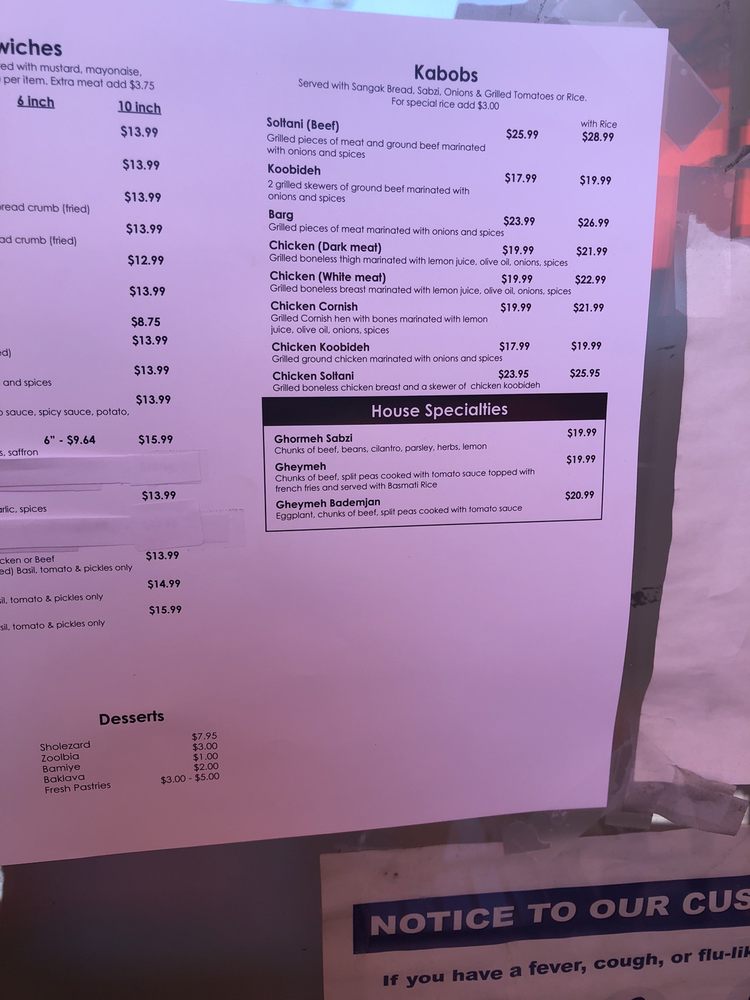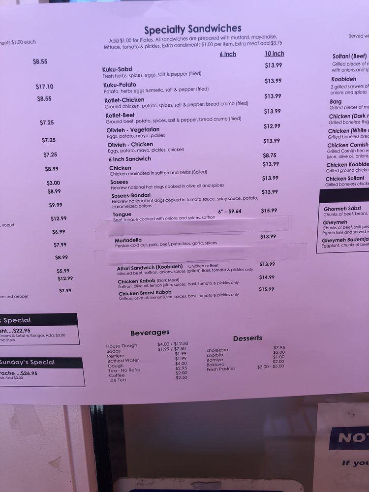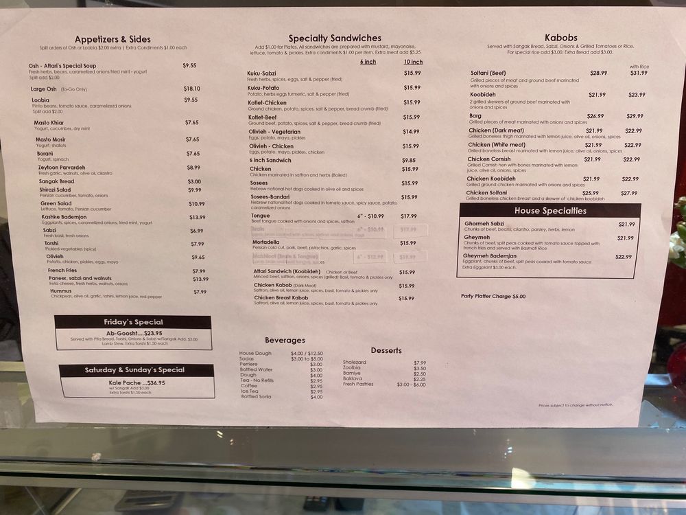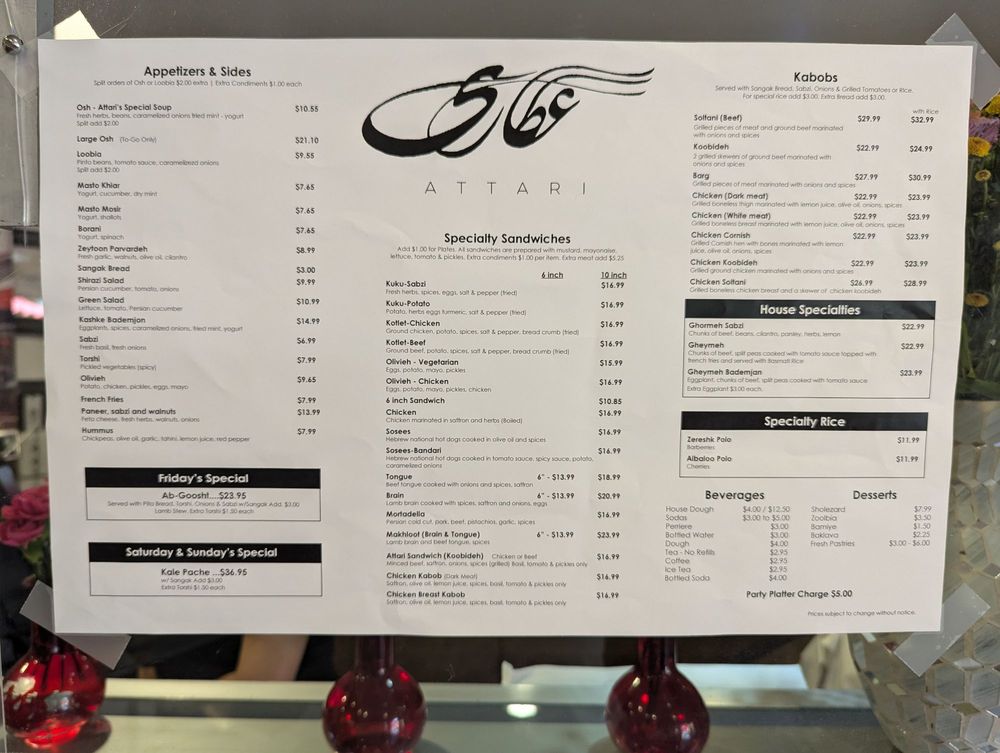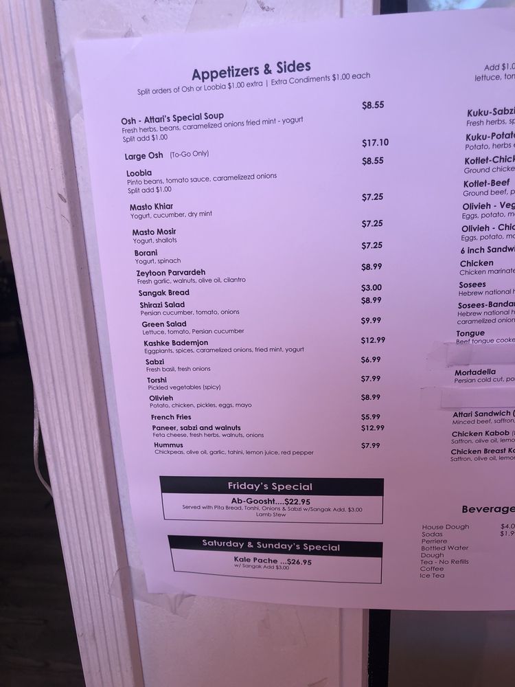 Welcome to Attari Sandwich Shop, a hidden gem in Los Angeles offering a unique blend of Persian flavors. With a variety of appetizers like Osh and Kashke Bademjon, as well as specialty sandwiches like the Beef Attari and Kuku Sabzi, Attari Sandwich Shop truly delivers on taste and quality. The Kabobs, including Chicken Koobideh and Ghormeh Sabzi, are cooked to perfection and are a must-try for any meat lover. The cozy atmosphere and excellent service make dining here a delightful experience. Customers rave about the friendly staff, generous portions, and the authentic Persian cuisine served here. Don't miss out on the chance to savor these delicious dishes at Attari Sandwich Shop!